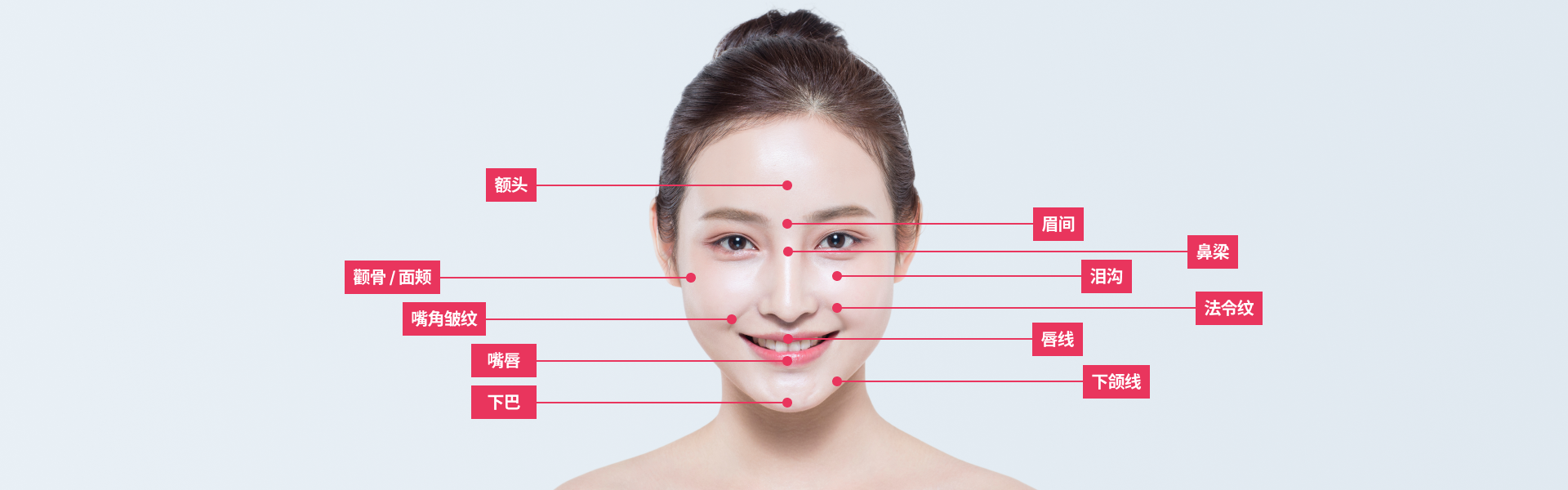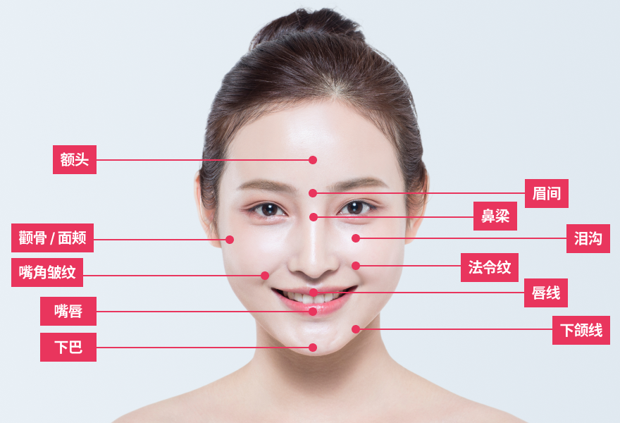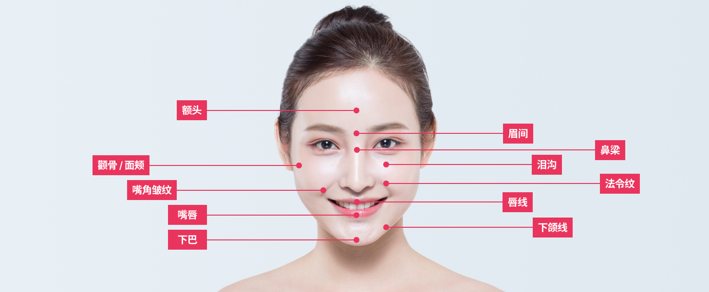 填充面部凹陷区域,增加立体感并减轻皱纹。包括额头、口周皱纹、整体面部细纹,