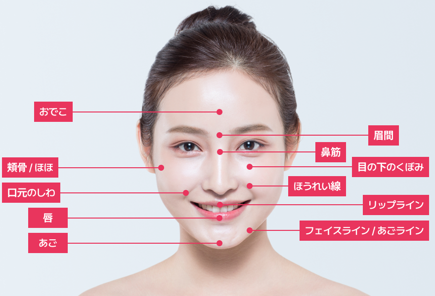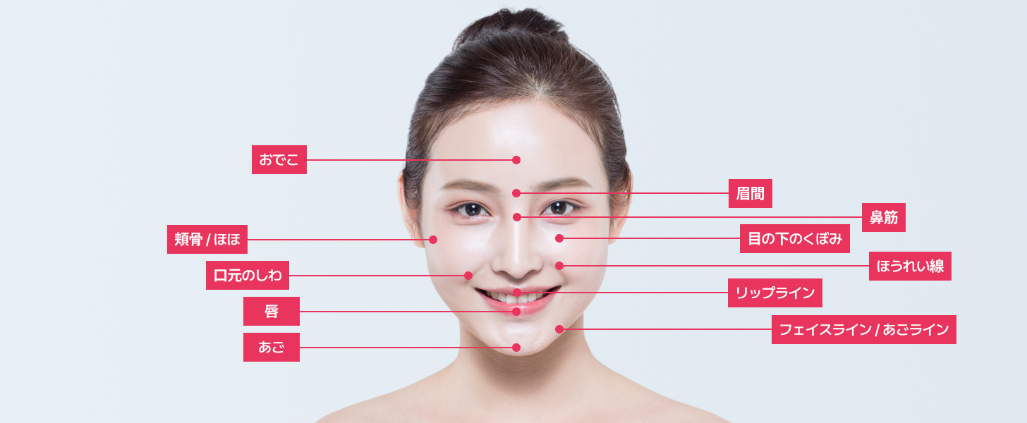 額や口元をはじめとした全体のシワ改善、低い鼻、凹んだ部分へのボリューム補填など、手軽に受けられる施術です。