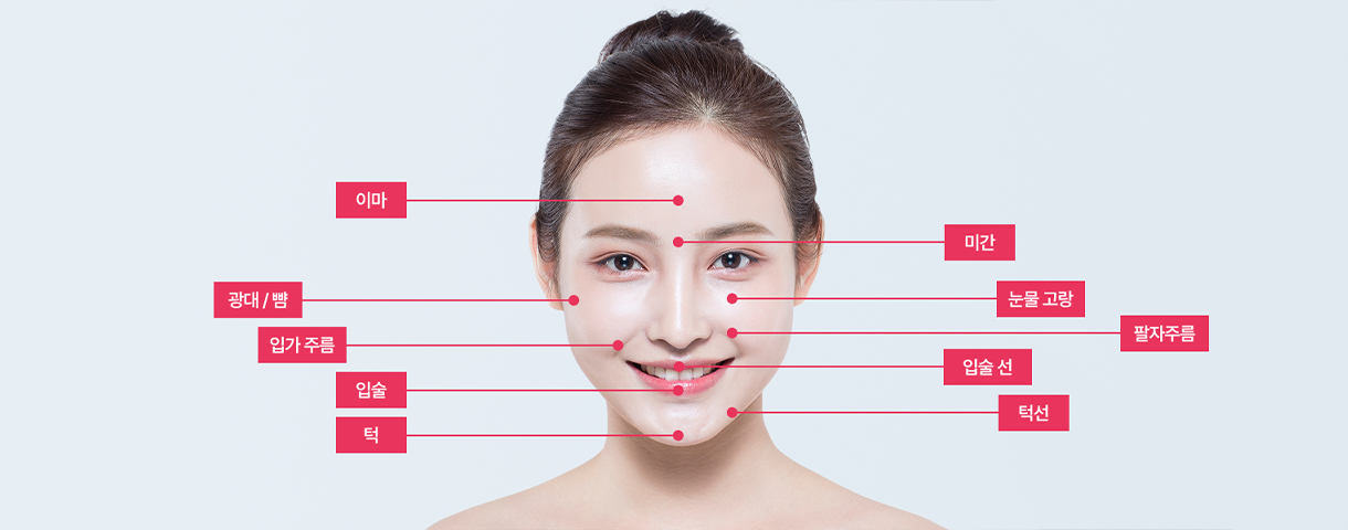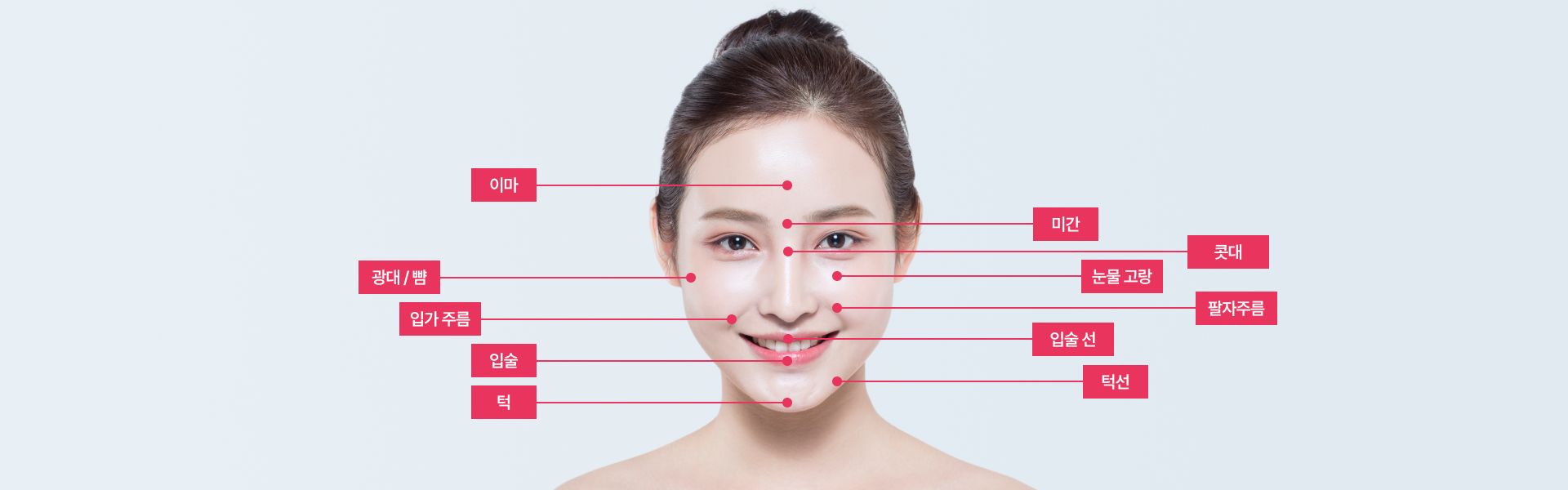 얼굴의 꺼진 부위를 채워 입체감을 더해주고 주름을 개선합니다. 이마나 입가를 비롯한 얼굴의 전체적 주름,